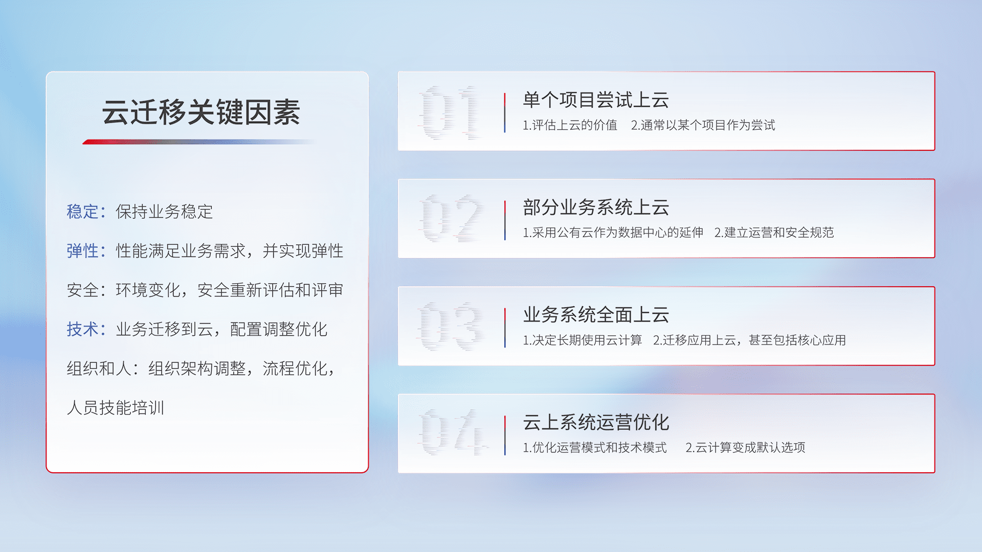 结合实际业务,,从规划设计、、、、云平台选型、、、云原生改造、、数据迁移、、集成交付,,,,迁移全过程为客户识别最佳上云路径,,,做好风险识别管理,,,设计网络架构、、、身份权限、、、安全审计合规、、、操作审计、、、日志审计、、、、监控告警策略、、、、多站点容灾设计等,,,对云上基础设施进行整体规划,,,提升IT治理水平,,,,以满足弹性、、、高可用、、高性能的需求。。。。