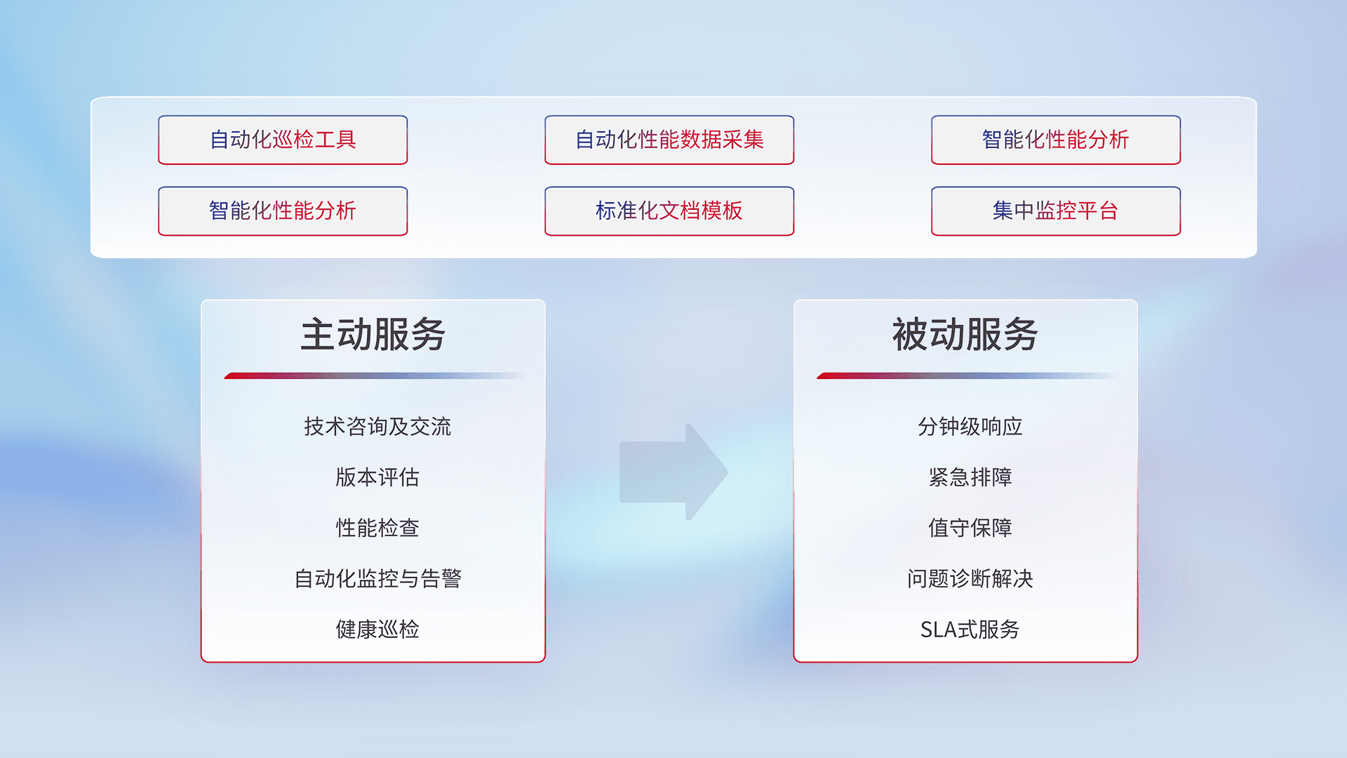 智能化工具和标准化文档,,保障服务质量,,,提供主动服务(包含技术咨询、、版本评估、、性能检查、、、自动化监控与告警、、健康巡检)和被动服务包含(分钟级响应、、、、紧急排障、、值守保障、、、问题诊断解决、、、、SLA服务)。。。